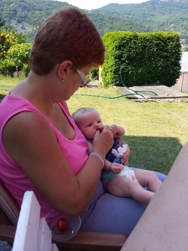 Babička krmí vnučku Kristýnku jahůdkou z našeho záhonku na chatě :) Pro Kristýnku to byla první ochutnávka jahůdky. A moc chutnala :)
