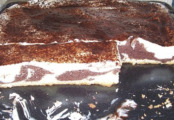 Postup Na vymazaný plech nalijeme světlé těsto, na něj dáme tmavé a nahoru dáme pudink. Upečeme na 180 °C. Na vychladlý základ natřeme krém a posypeme grankem. |